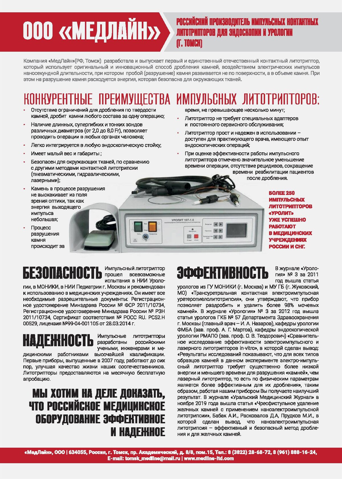 Компания «МедЛайн» (г.Томск) более 15 лет выпускает отечественные контактные литотрипторы, которые используют оригинальный и инновационный способ дробления камней, образующихся в организме человека: при воздействии электрического импульса наносекундной длительности пробой (разрушение) камня развивается не по поверхности, а в объеме камня. При этом на разрушение материала расходуется малая энергия, которая безопасна для окружающих тканей. Более 200 литотрипторов успешно работают для лечения МКБ в урологических отделениях РФ и СНГ, с 2017 года начат выпуск литотрипторов для лечения камней холедоха.